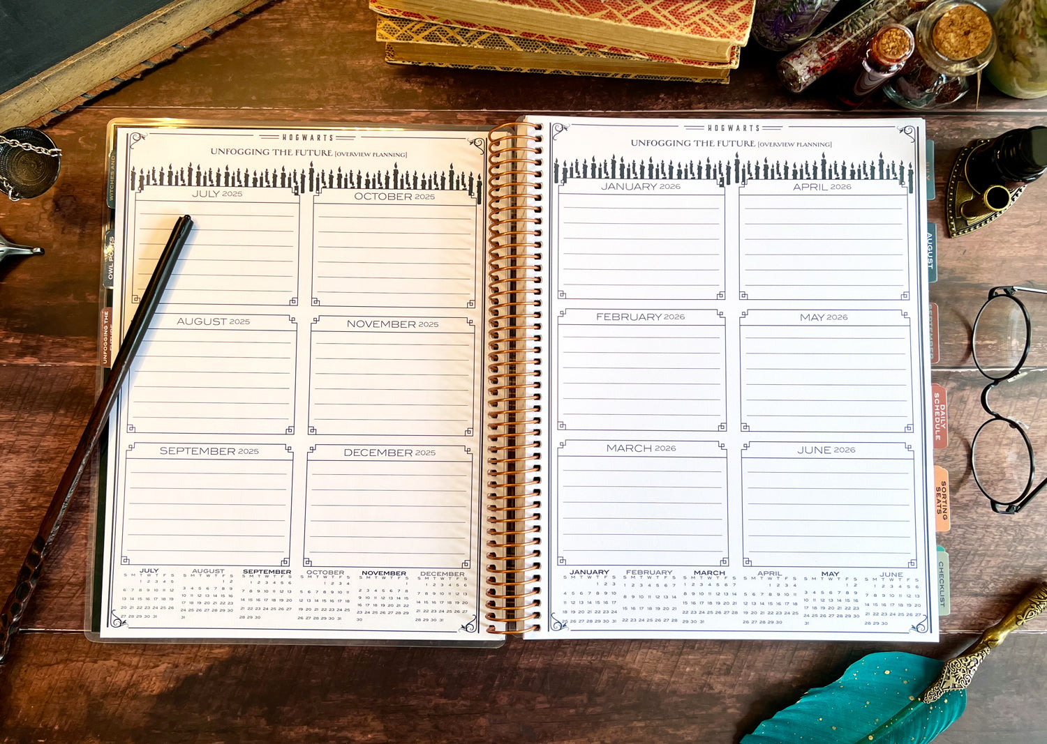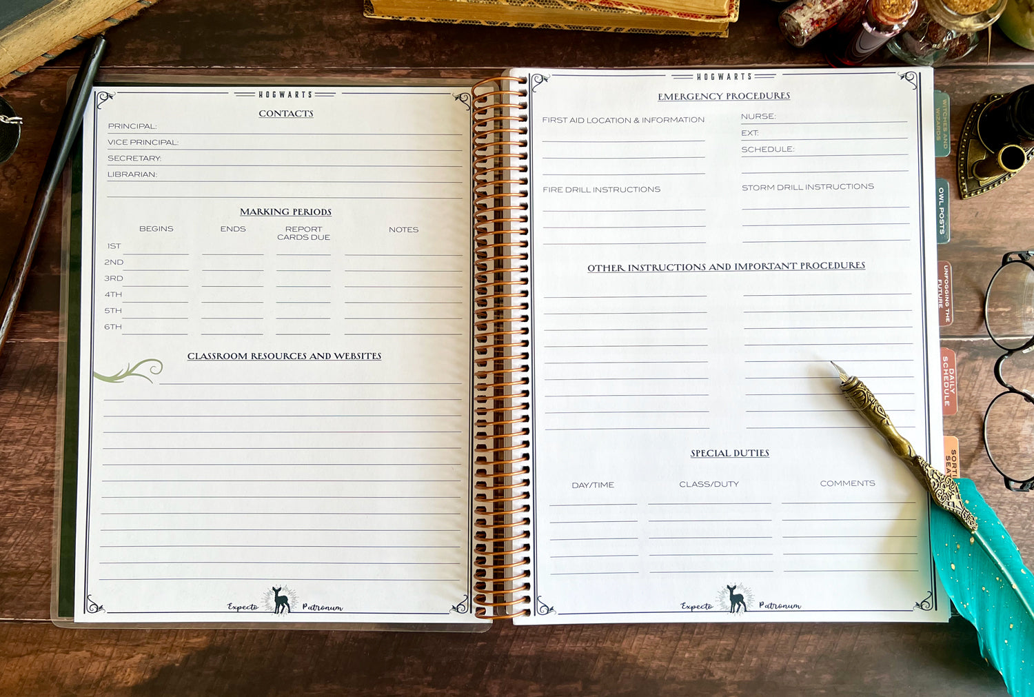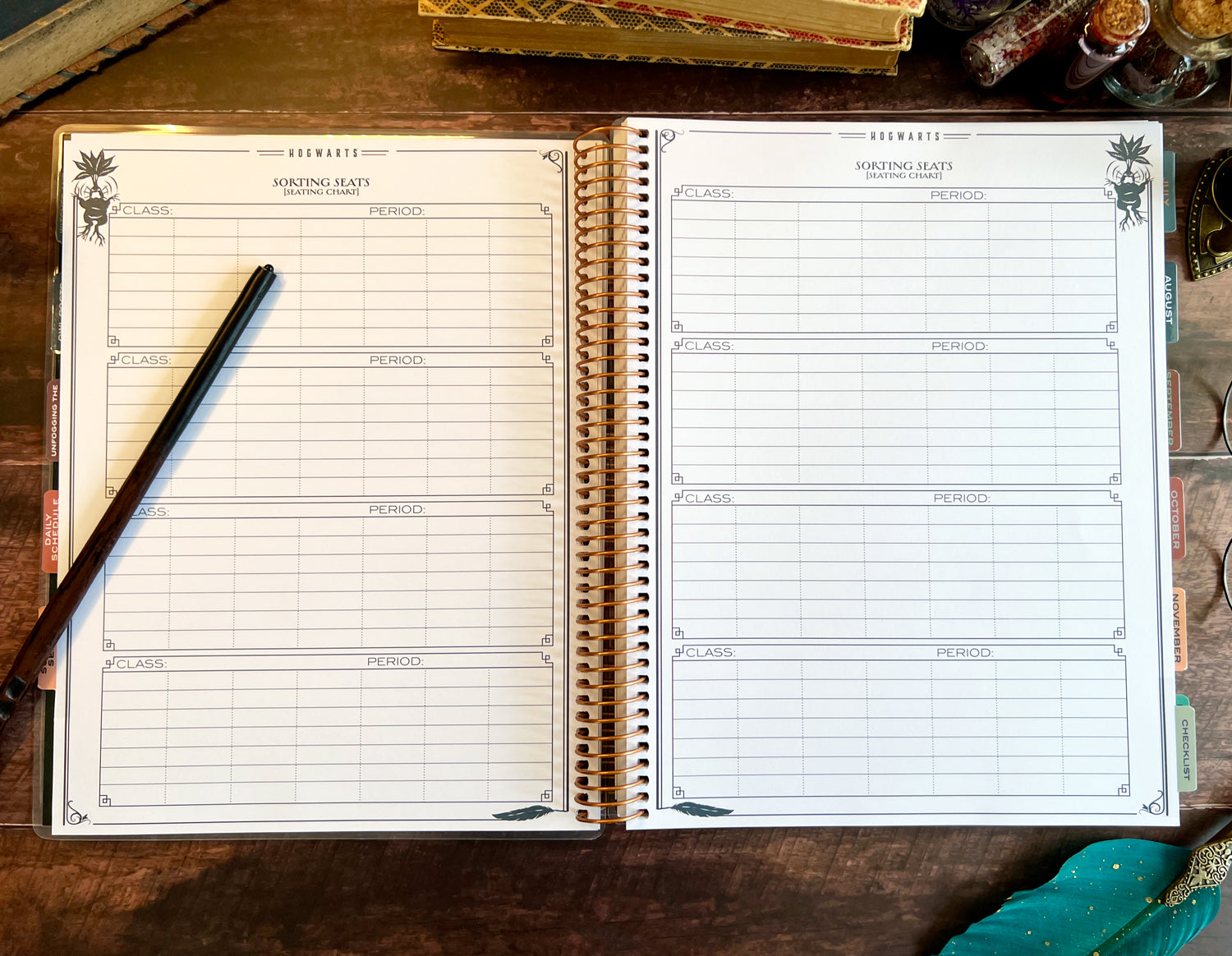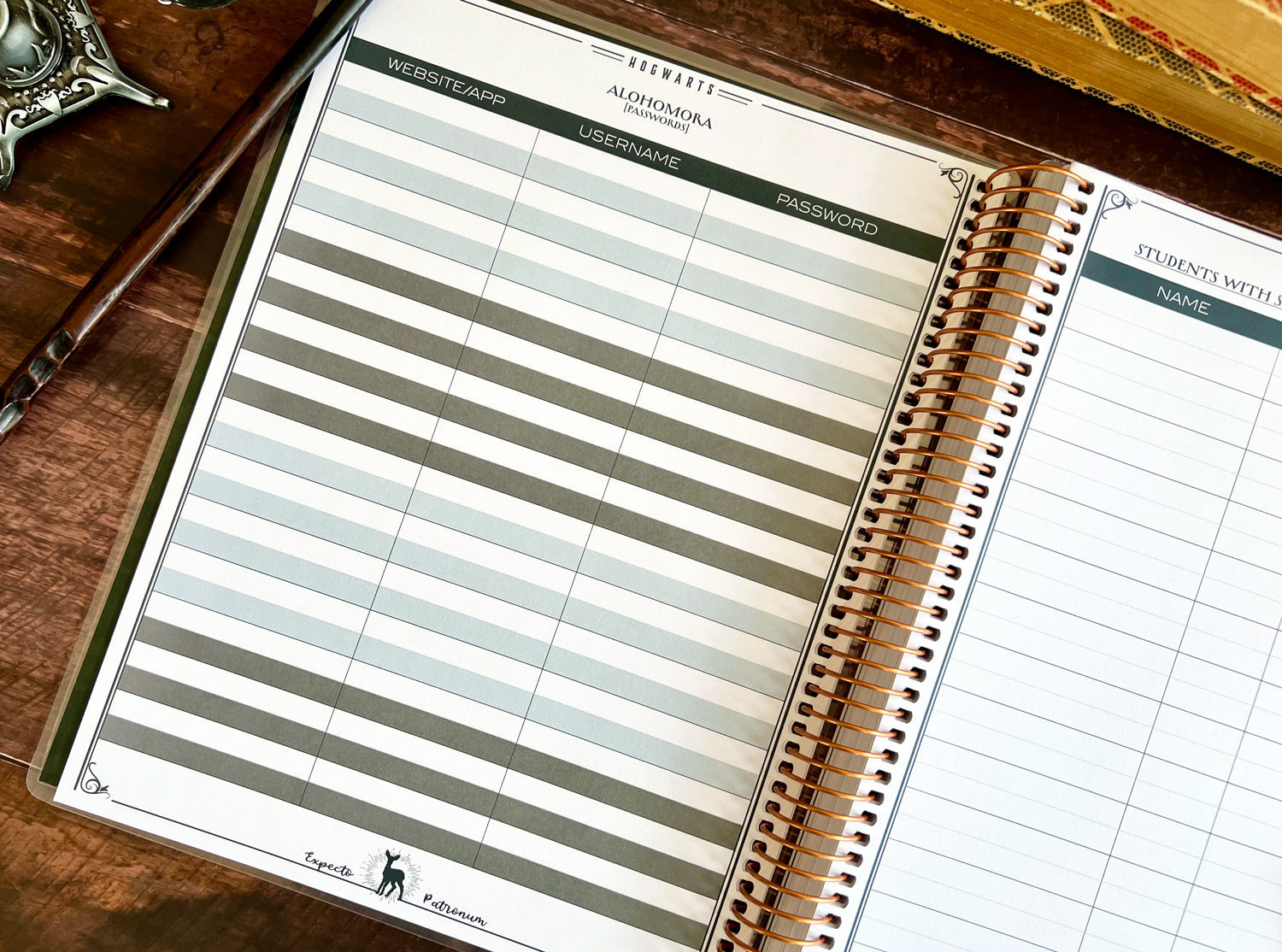 This full-size, 9.5'' x 11.25'' coil-bound planner is designed to help you manage every detail of your classroom with wizarding-level organization. Created with input from an experienced educator, our 2025-2026 teacher planner features essential sections like Witches and Wizards (student list), Owl Posts (communication log), Unfogging the Future (overview planning), Sorting Seats (seating charts), daily schedules, and checklists.