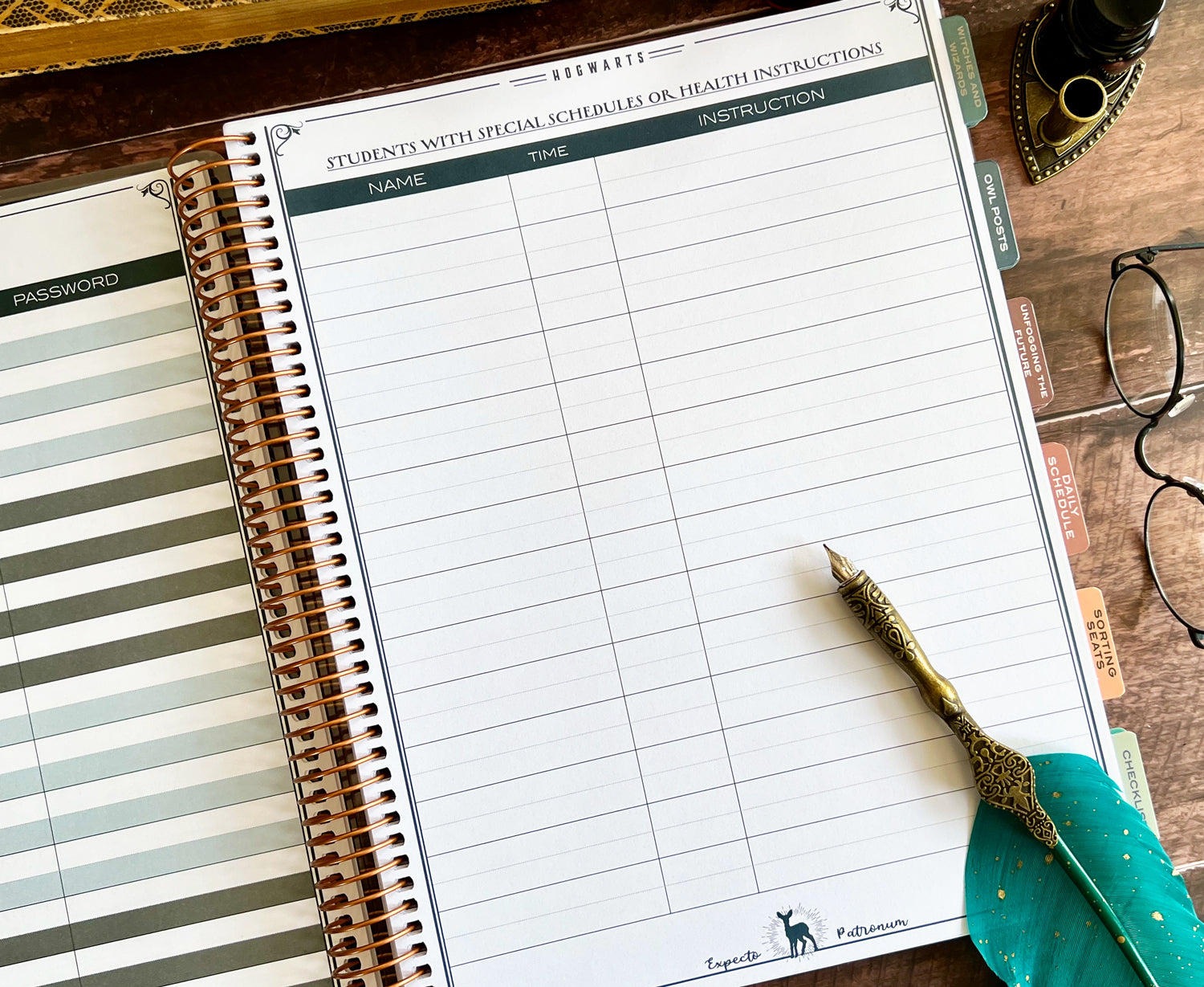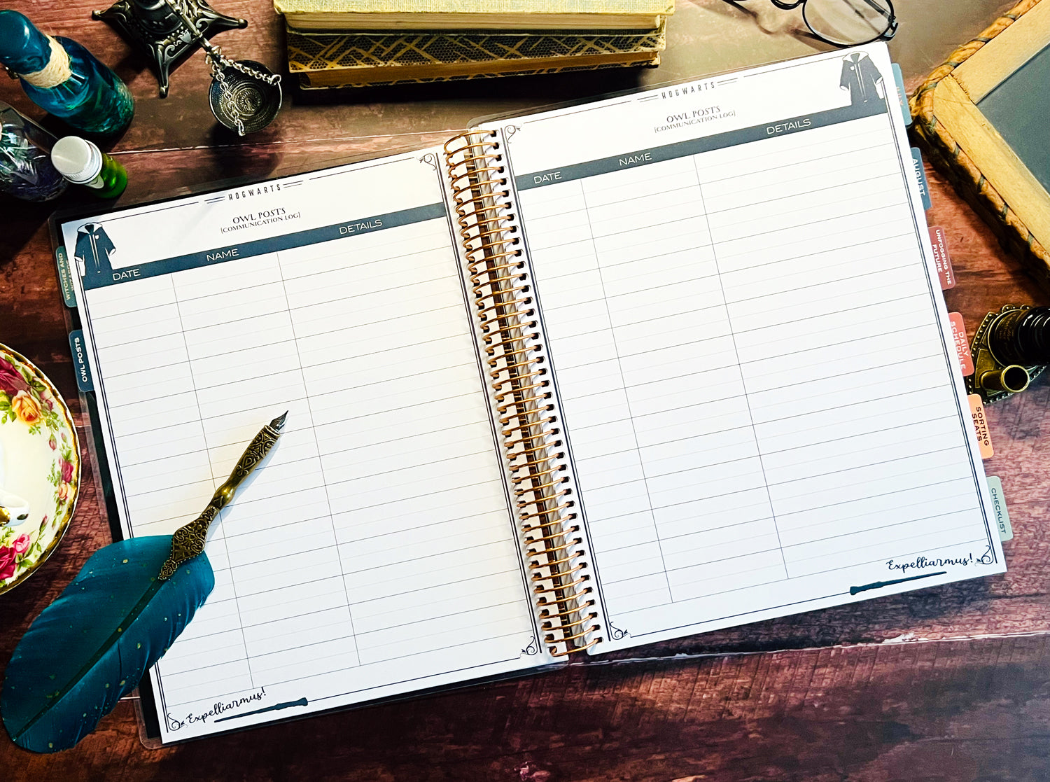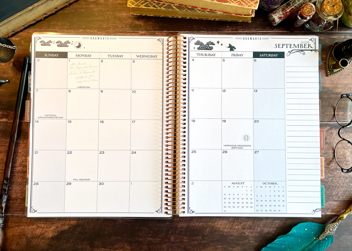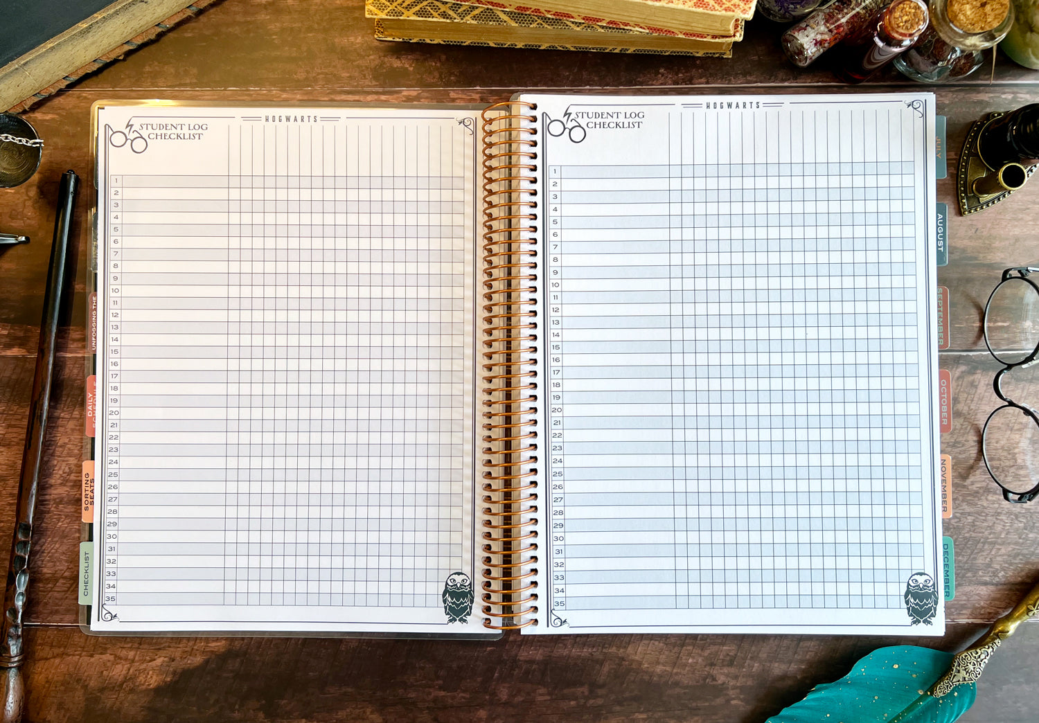 This full-size, 9.5'' x 11.25'' coil-bound planner is designed to help you manage every detail of your classroom with wizarding-level organization. Created with input from an experienced educator, our 2025-2026 teacher planner features essential sections like Witches and Wizards (student list), Owl Posts (communication log), Unfogging the Future (overview planning), Sorting Seats (seating charts), daily schedules, and checklists.