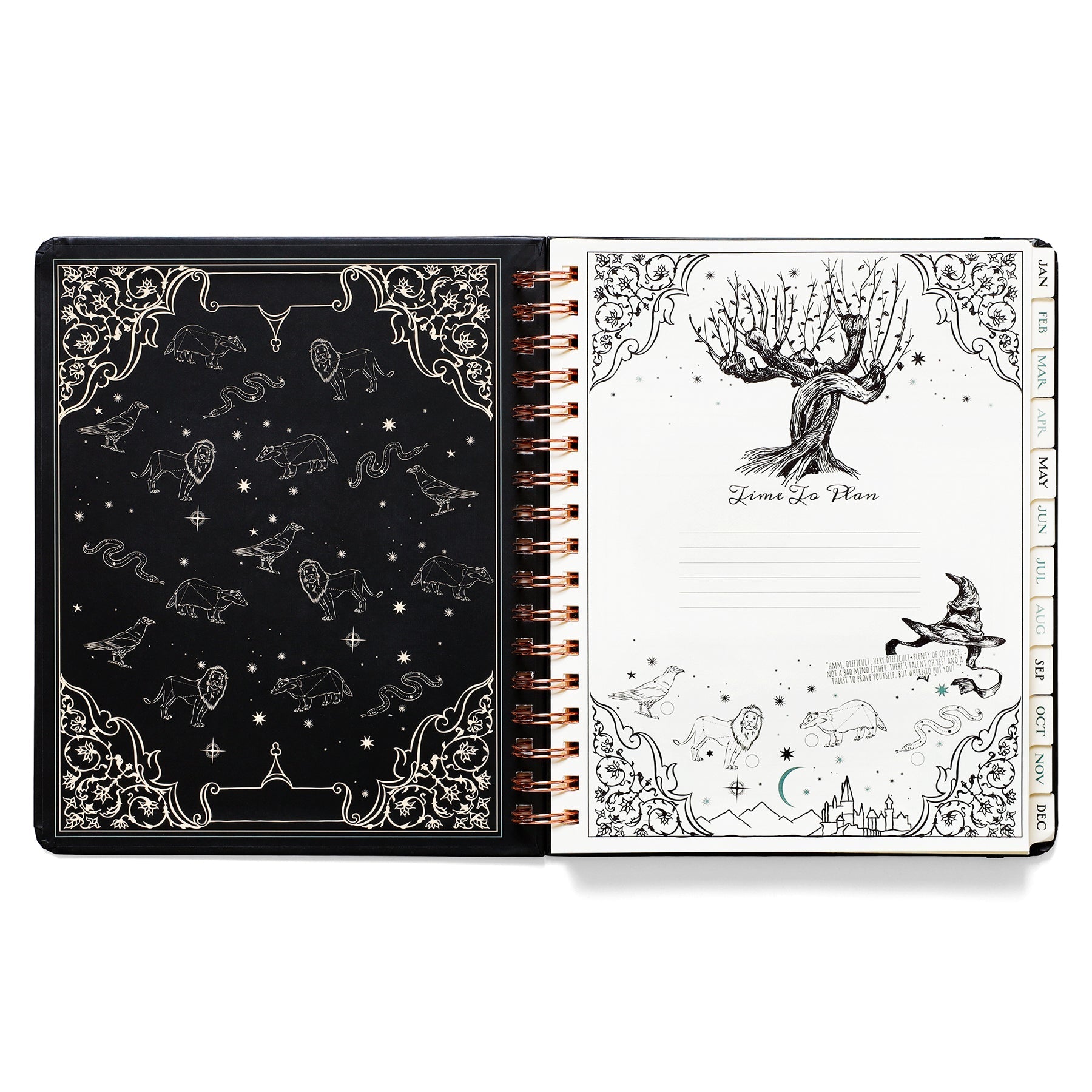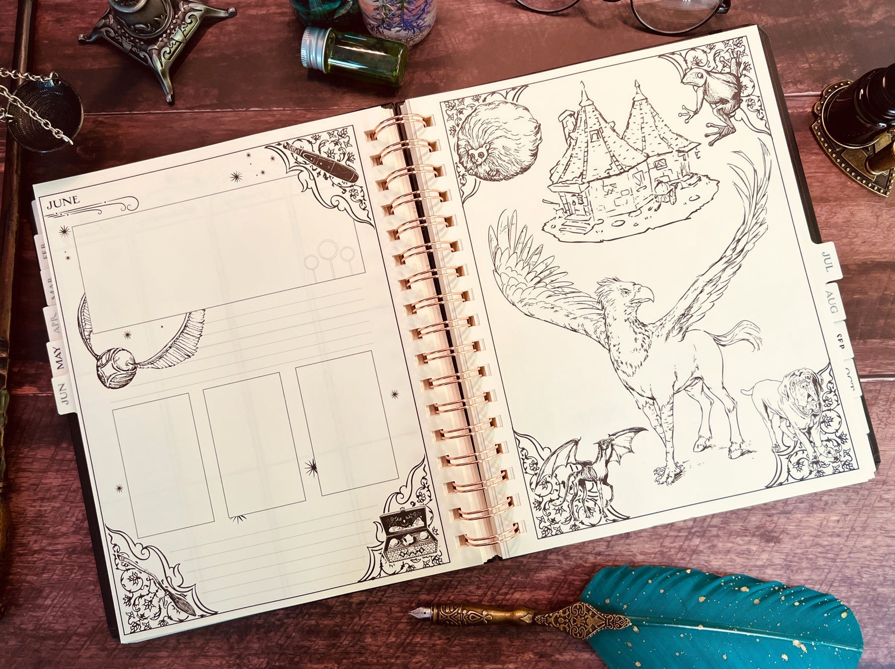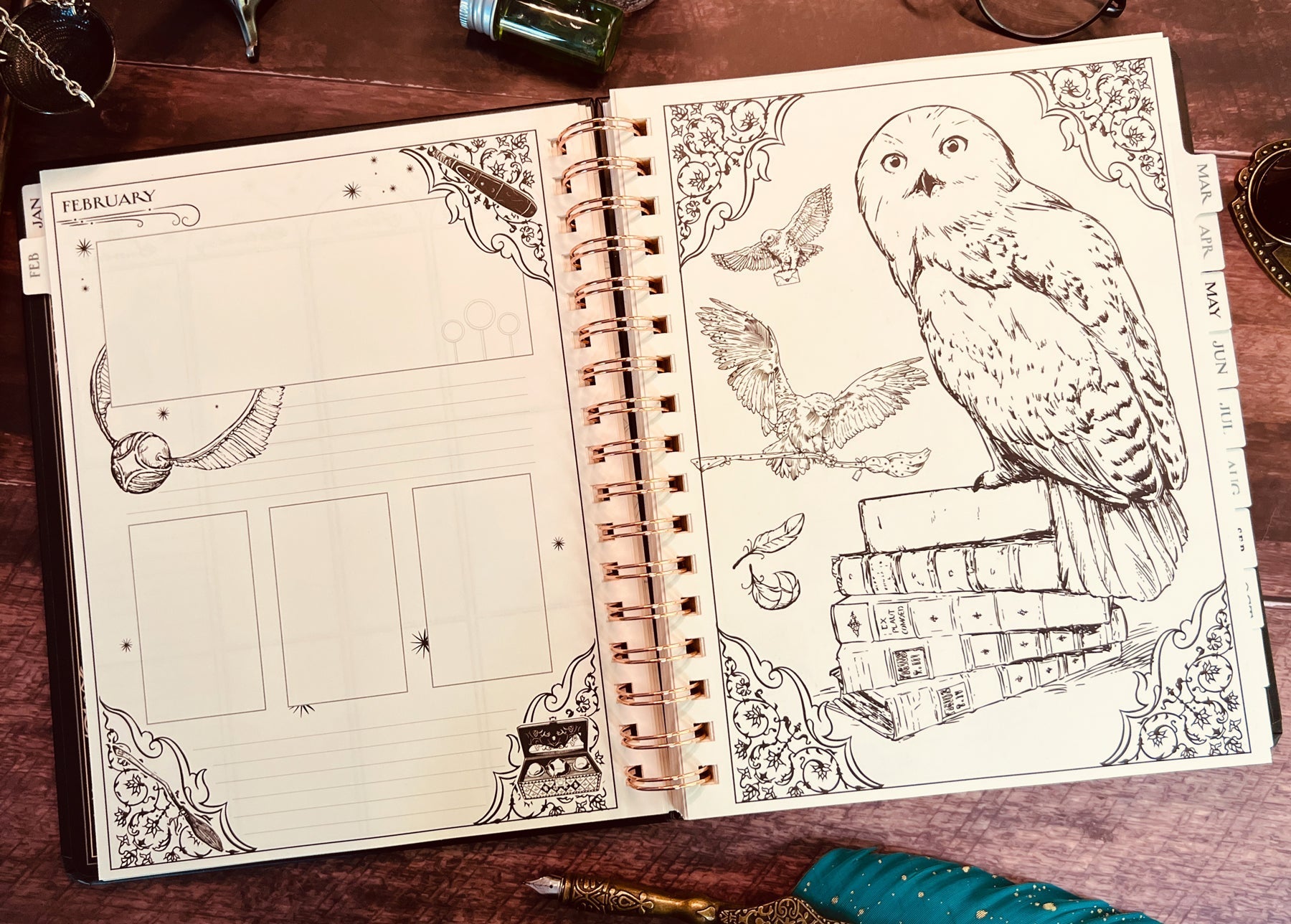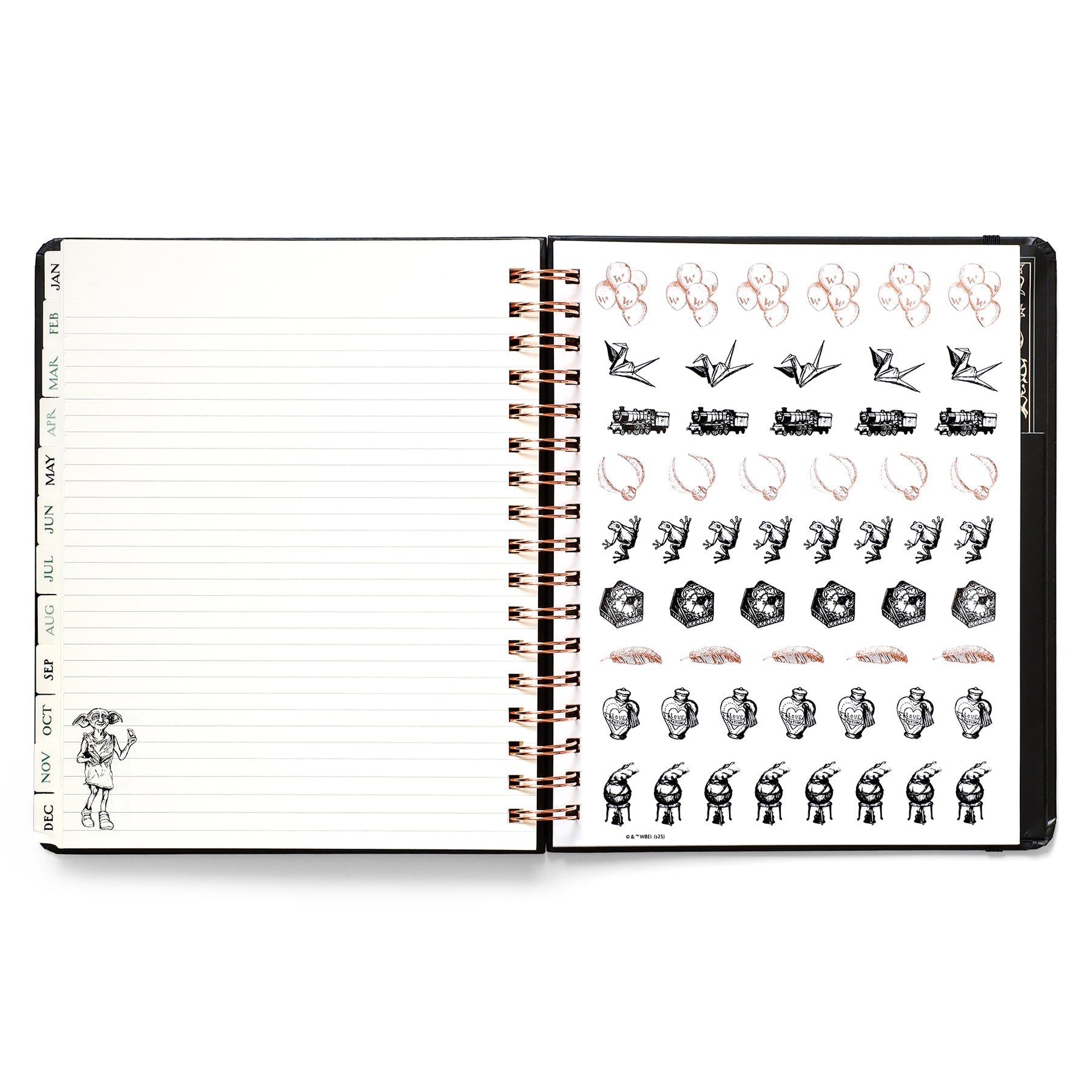 Inside, you'll find full monthly spreads and vertical weekly pages to plan your days, weeks, and months. Each month features a unique tabbed page with spellbinding artwork that you can color in (or not!) and habit-tracking tools on the flip side. You'll also find holidays, character birthdays, and notable dates, plus four sheets of Harry Potter-themed planner stickers to add some extra charm to your planning.