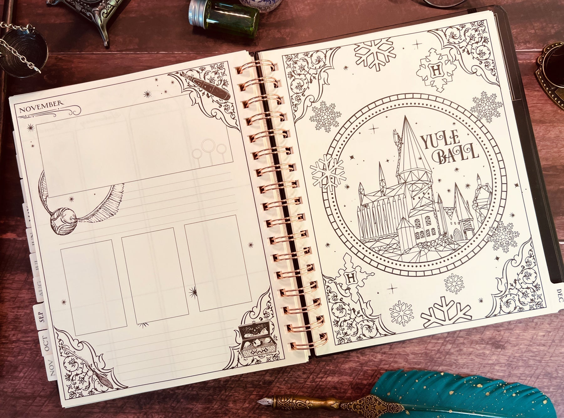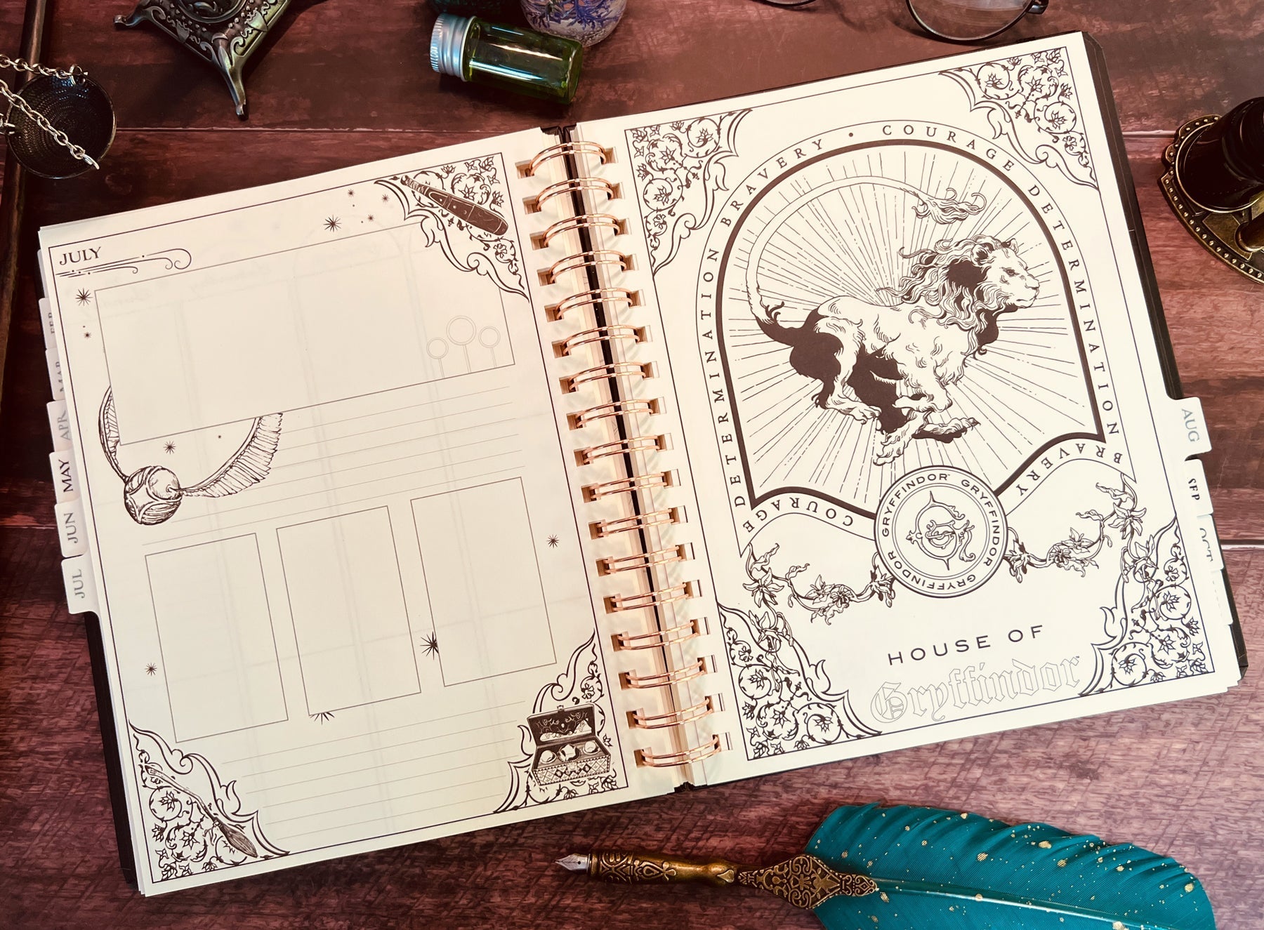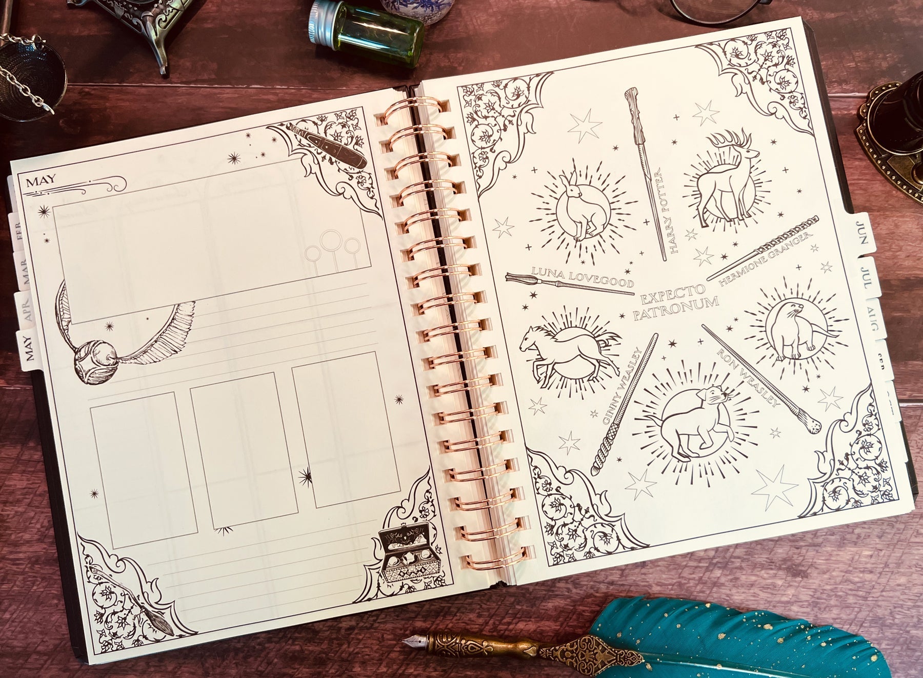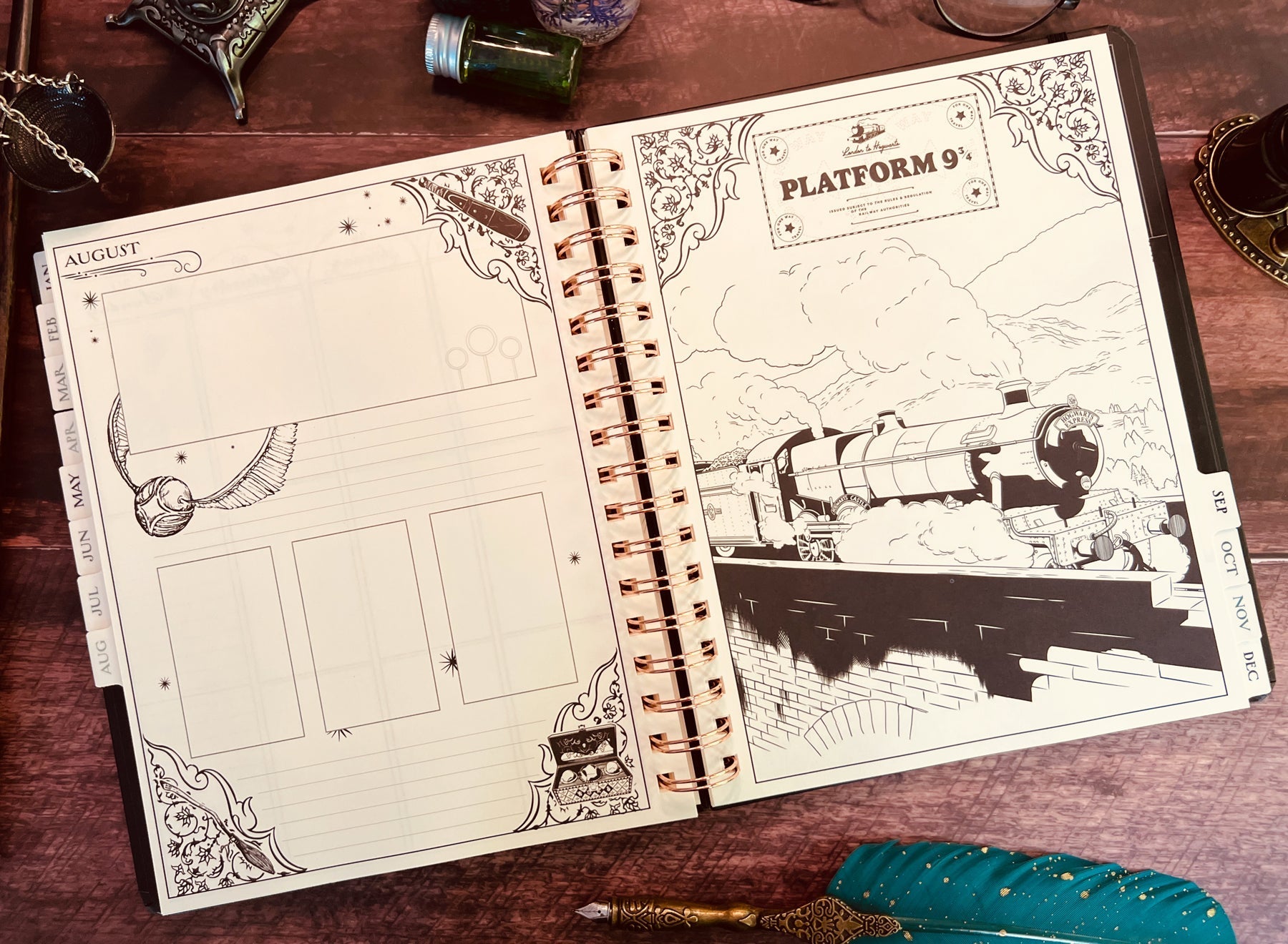 Inside, you'll find full monthly spreads and vertical weekly pages to plan your days, weeks, and months. Each month features a unique tabbed page with spellbinding artwork that you can color in (or not!) and habit-tracking tools on the flip side. You'll also find holidays, character birthdays, and notable dates, plus four sheets of Harry Potter-themed planner stickers to add some extra charm to your planning.