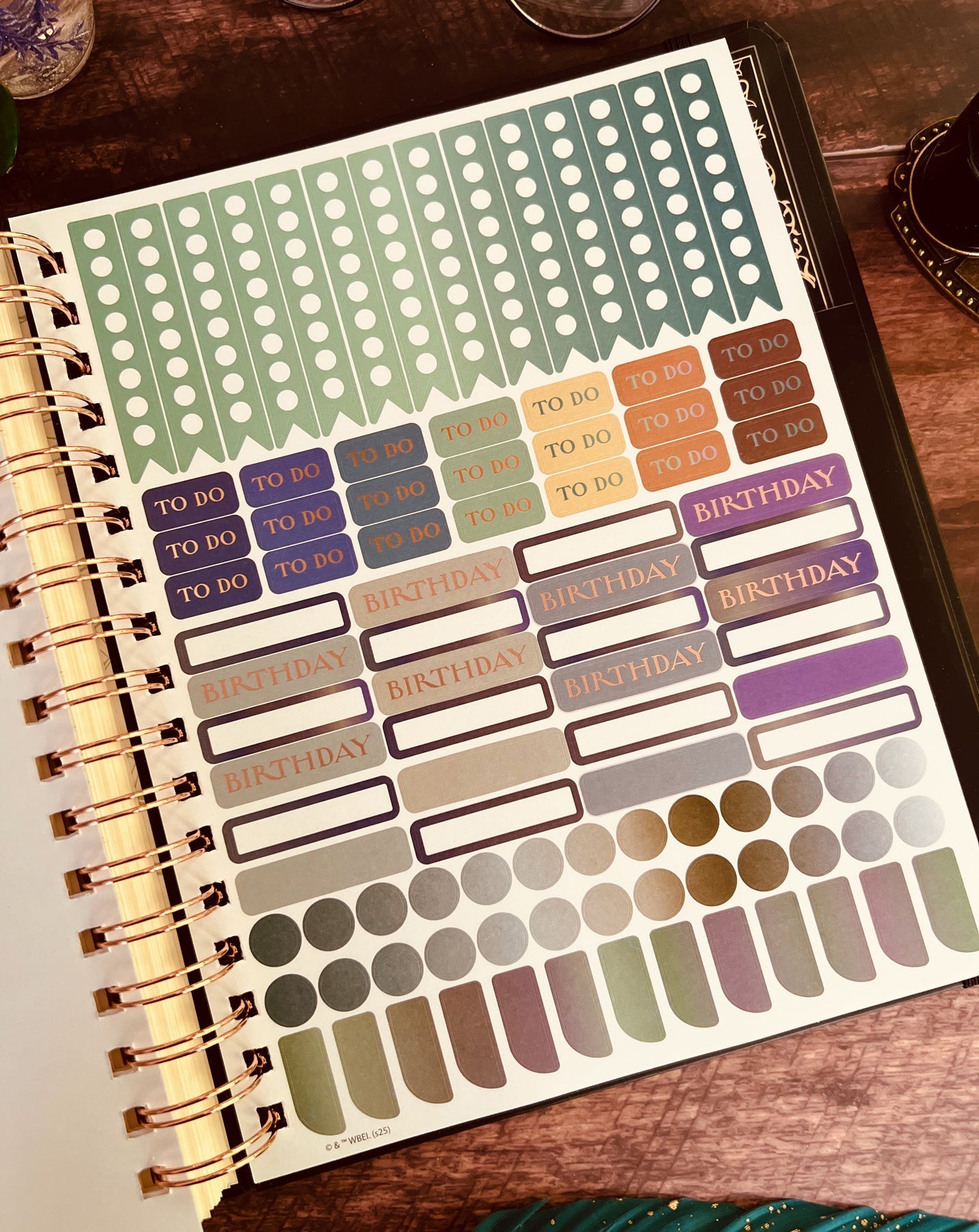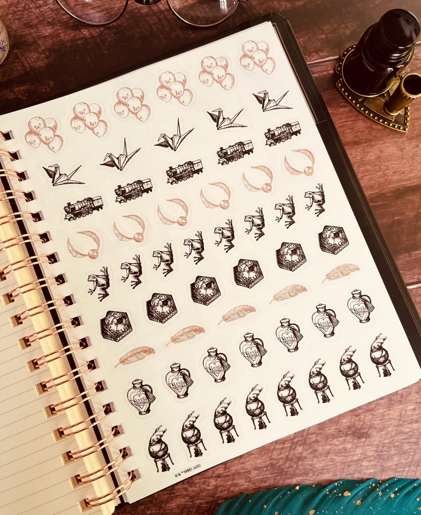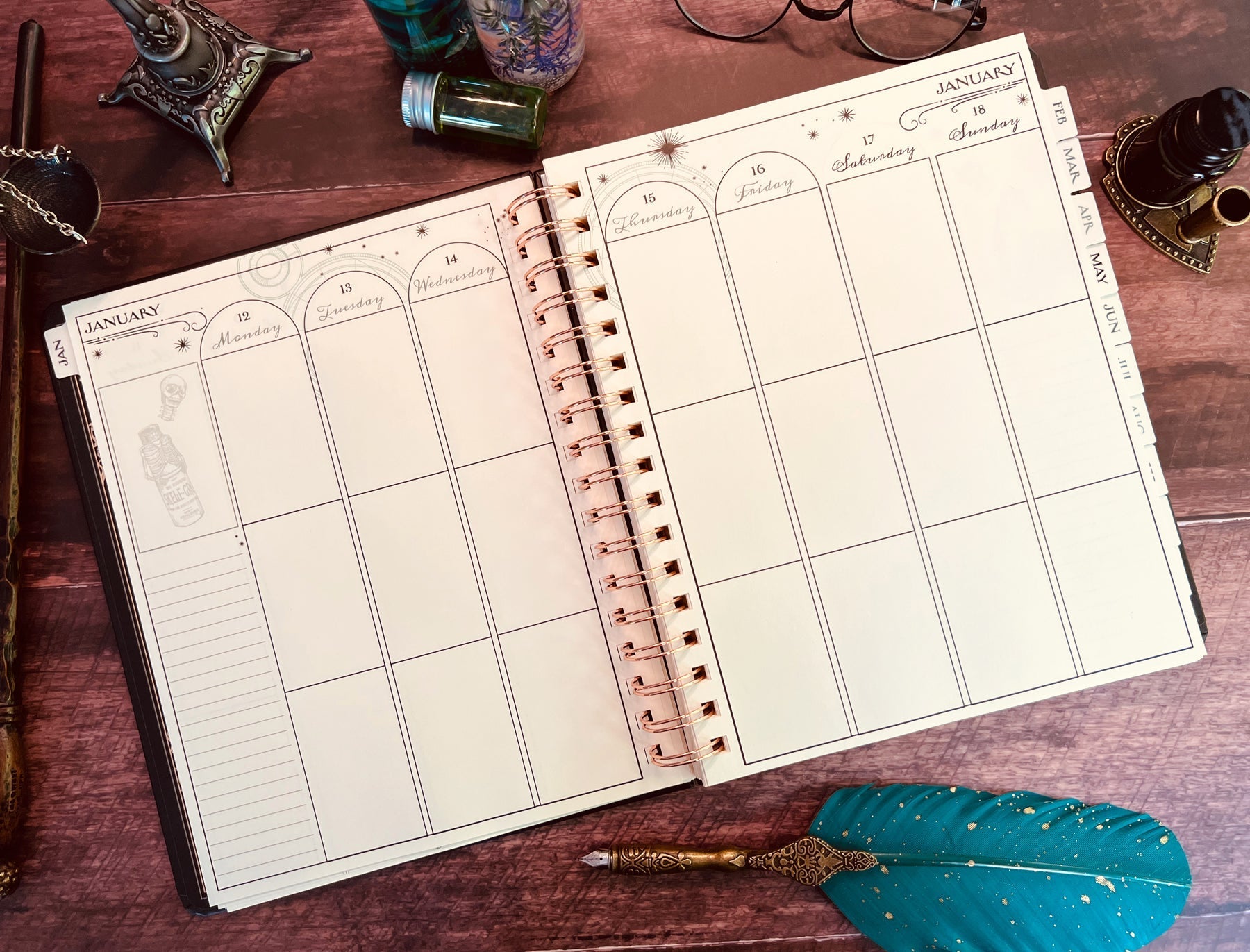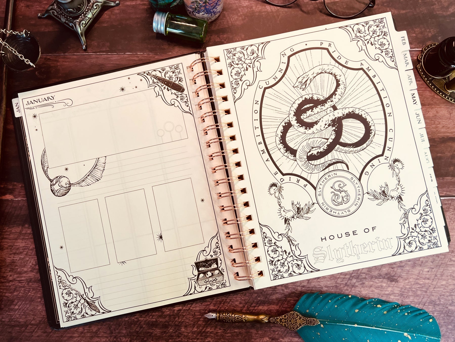 Inside, you'll find full monthly spreads and vertical weekly pages to plan your days, weeks, and months. Each month features a unique tabbed page with spellbinding artwork that you can color in (or not!) and habit-tracking tools on the flip side. You'll also find holidays, character birthdays, and notable dates, plus four sheets of Harry Potter-themed planner stickers to add some extra charm to your planning.