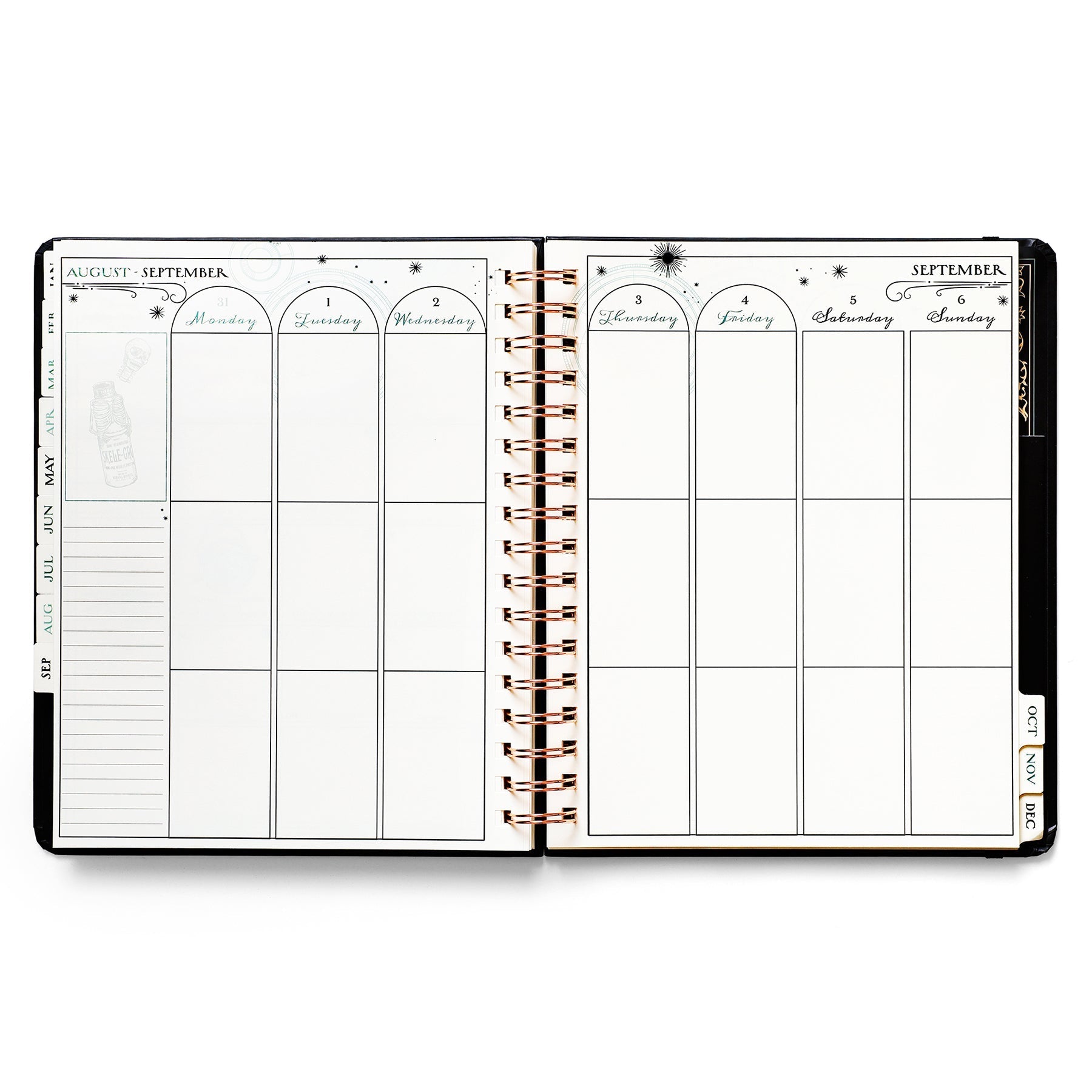 - Weekly/Monthly format with full monthly calendar spreads and vertical weekly pages